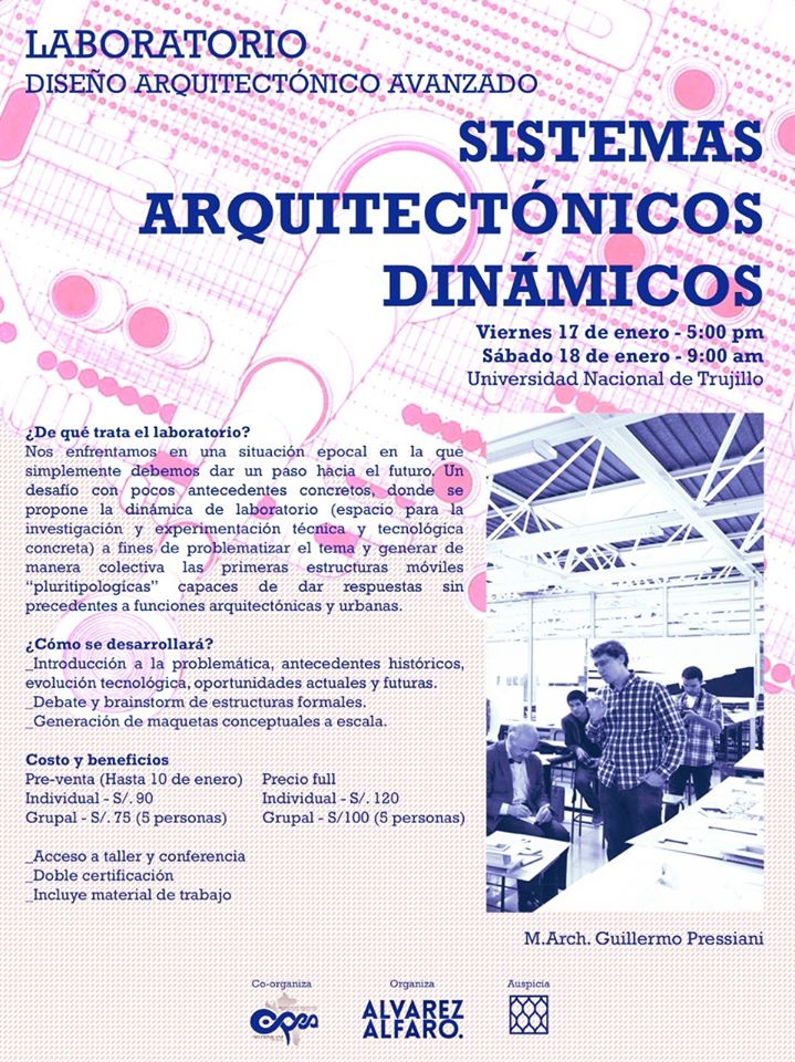 El pasado viernes 17 y sábado 18 de enero del 2020 un grupo de entusiastas de la arquitectura con perspectiva futura nos encontramos en Trujillo para estudiar, debatir y proyectar nuevos Sistemas Arquitectónicos Dinámicos como respuesta lógica de un sistema productivo / social extremadamente rico en una sociedad en constante cambio. Dicho encuentro fue posible gracias al impulso del estudio Álvarez Alfaro Arquitectos y OPEA UNT.