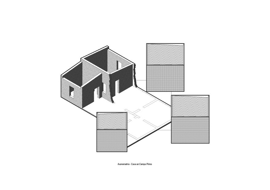 Se interviene sobre una ruina de una antigua vivienda rural que data de poco más de medio siglo, localizada en las cercanías del poblado de Sa Pereira, en medio de un monte pampeano santafesino. La renta de tierras para cultivo y la migración de sus habitantes a ámbitos urbanos hicieron que esta estructura quede totalmente abandonada. A lo largo de las últimas décadas la ruina sufrió deterioro en sus cimientos a raíz de napas freáticas altas, grietas en sus muros, caída de muros exteriores a causa de un incendio en su fachada norte, levantamiento de piso a raíz de presencia de animales que hacen cuevas, y destrucción de todo tipo de detalles por vandalismo.