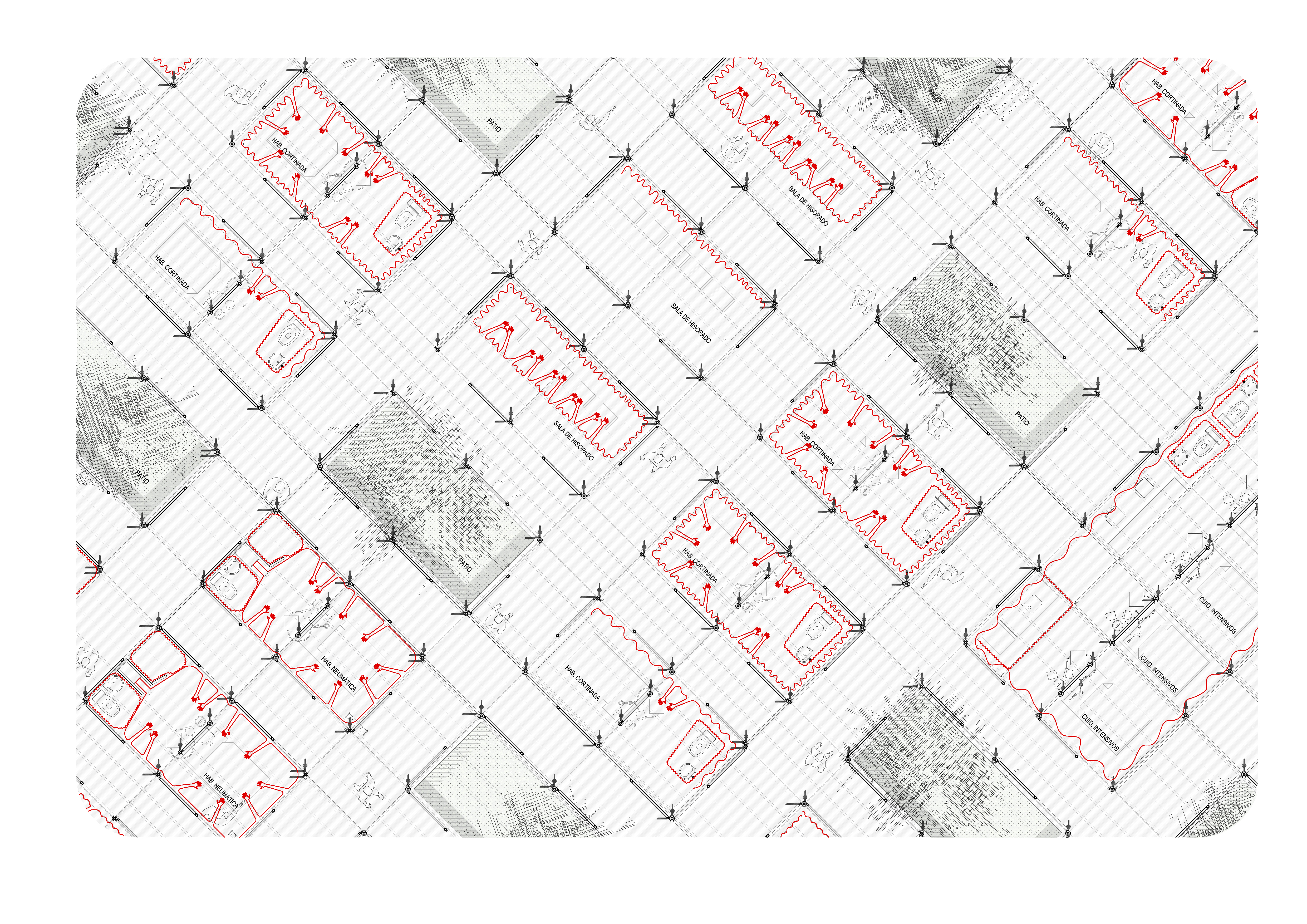 Al estar destinado para un emplazado hipotético y atemporal, se plantea una estructura de andamios con capacidad de mutar de acuerdo a la necesidad del momento, capaz de absorber los cambios que la sociedad requiera. Además, la practicidad de su construcción permite la variante de construir comunitariamente. En su interior los espacios son divididos según la demanda y los módulos para pacientes infectados quedan definidos por un “anillo” de cortinas con mangas especiales o por una burbuja neumática con las mismas características. La utilización de un modelo u otro depende específicamente de cada caso.