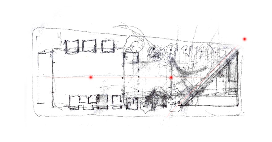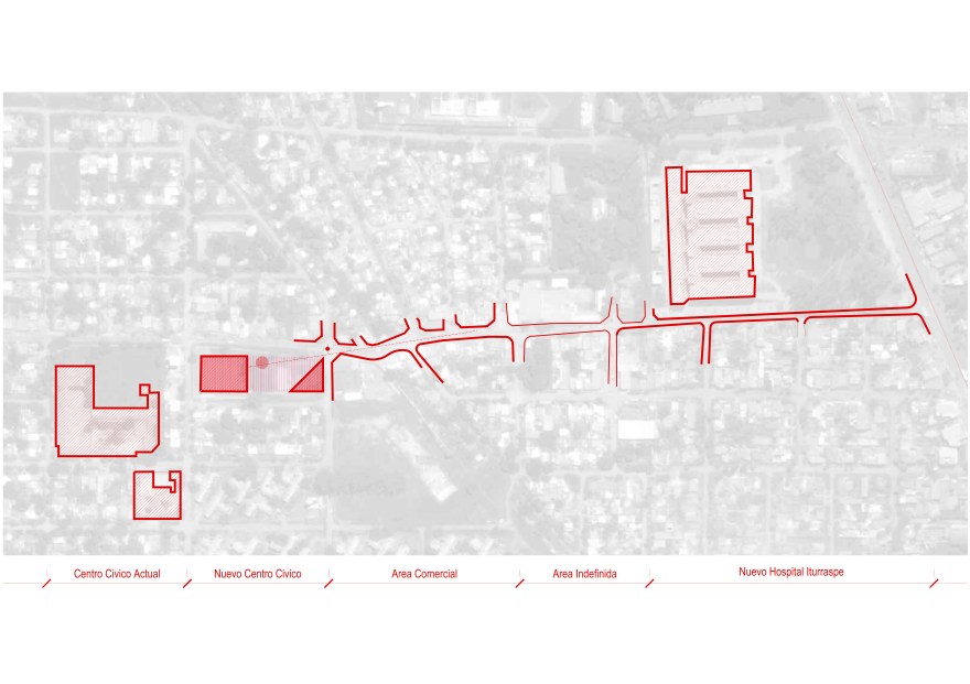 Si bien nuestra propuesta de una plaza triangular podría argumentarse como respuesta lógica a la concentración / desconcentración del público masivo que ingresa / egresa del estadio; lo que realmente determinaba la presencia de este vacío, era la necesidad de mantener de manera imperante una conexión visual directa entre el centro comercial y “la puerta” del estadio. Dicha conexión visual directa es posible gracias a una inflexión de la trama urbana producto del paso de la antigua línea de ferrocarril. Dicho accidente genera la creación de un eje visual que terminaría en dicho acceso principal.
