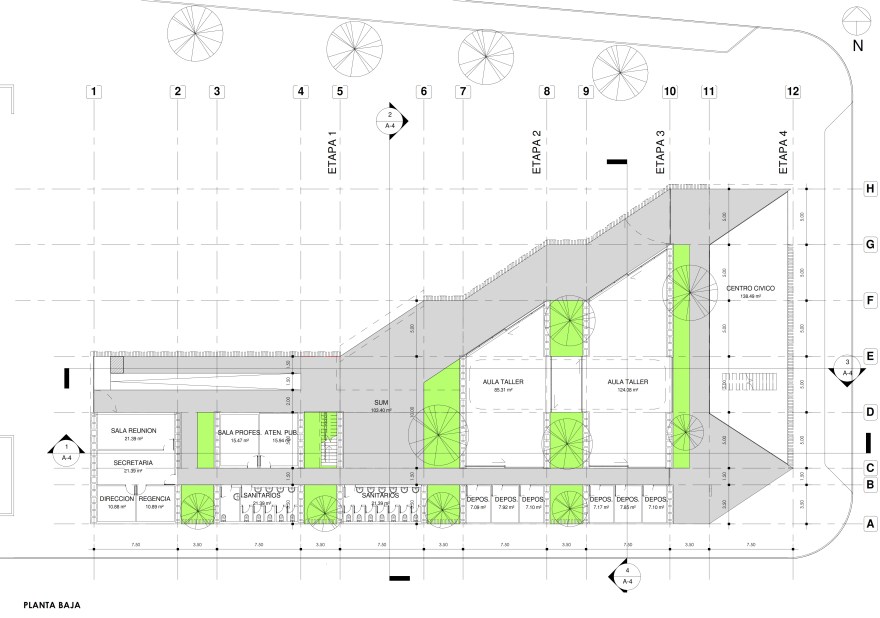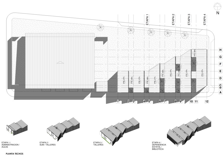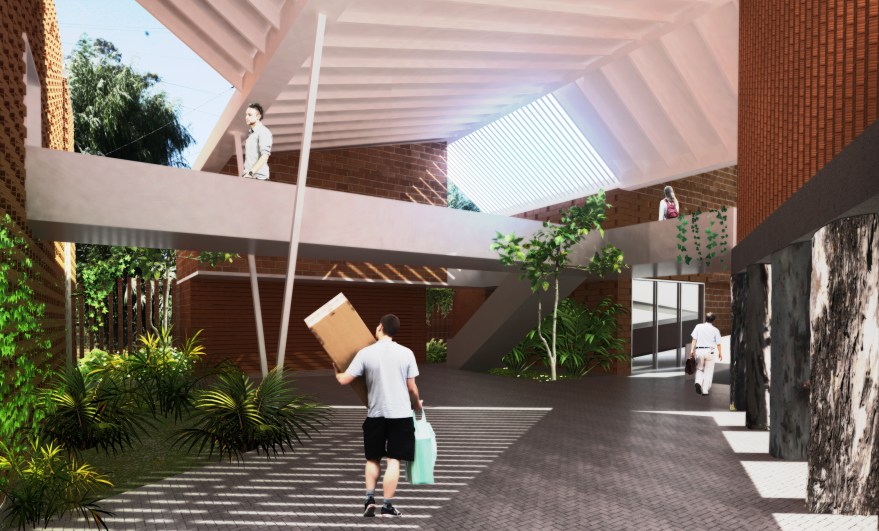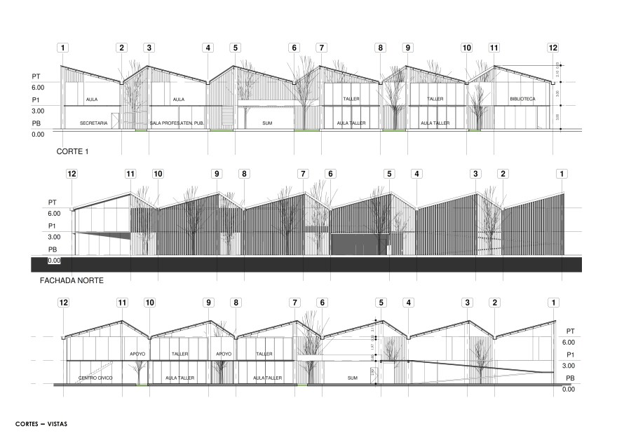 Subordinado a dicho escenario urbano, se propone un edificio con una fachada totalmente dinámica como fondo, talleres capaces de compartimentar en diferentes sentidos, y un austero sistema constructivo de ladrillo cerámico industrializado visto.